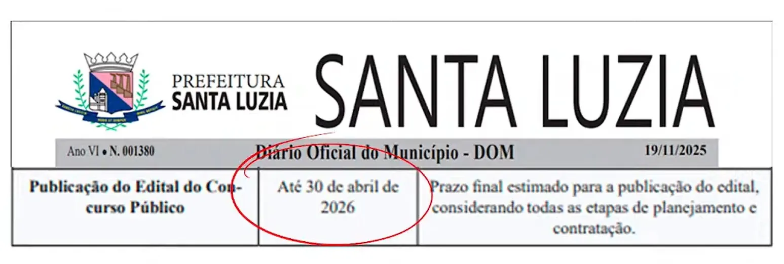 A Prefeitura de Santa Luzia, em Minas Gerais, confirmou um novo concurso público para 2026. A confirmação foi feita por meio do Diário Oficial do Município, onde a data máxima para a publicação do edital também já foi definida: 30 de abril de 2026.